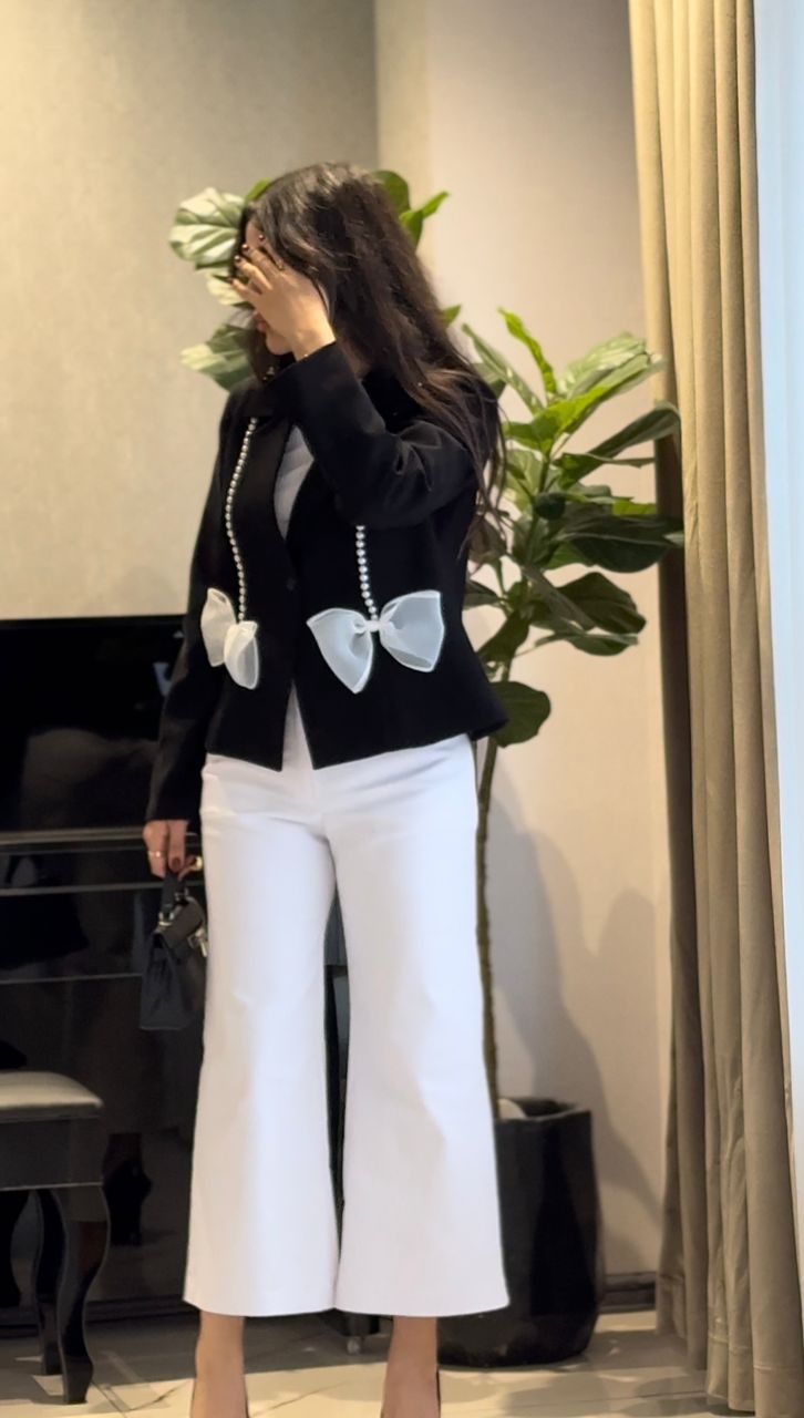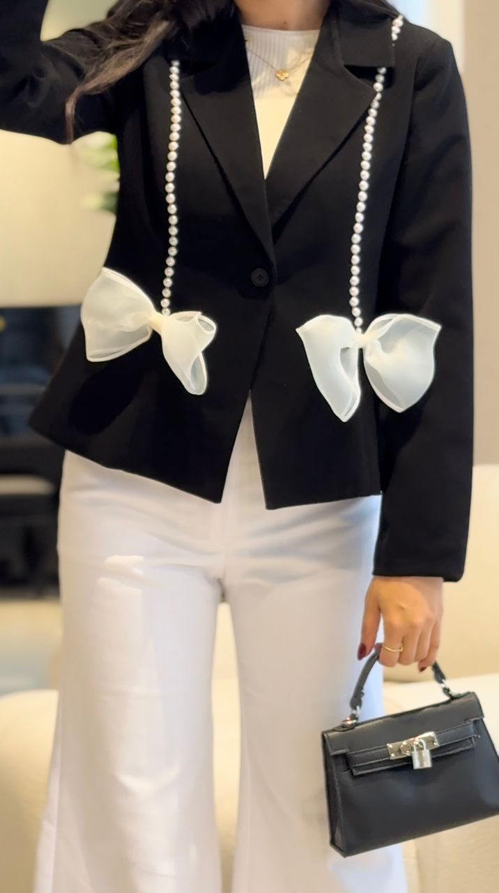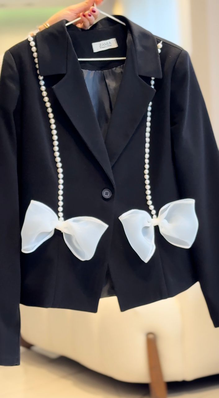 جنس دیتیل روی کت مروارید برجسته و پاپیون حریر هست
